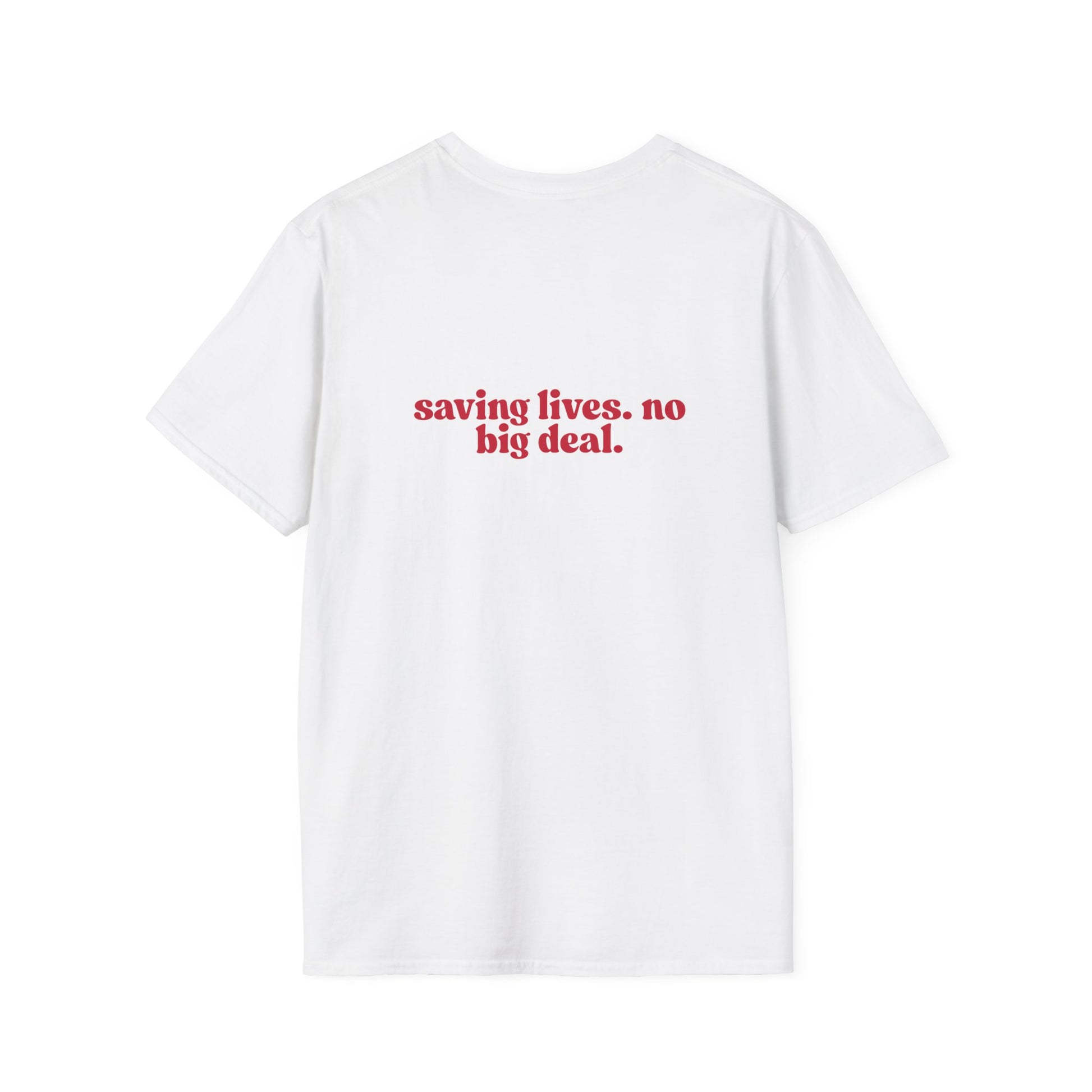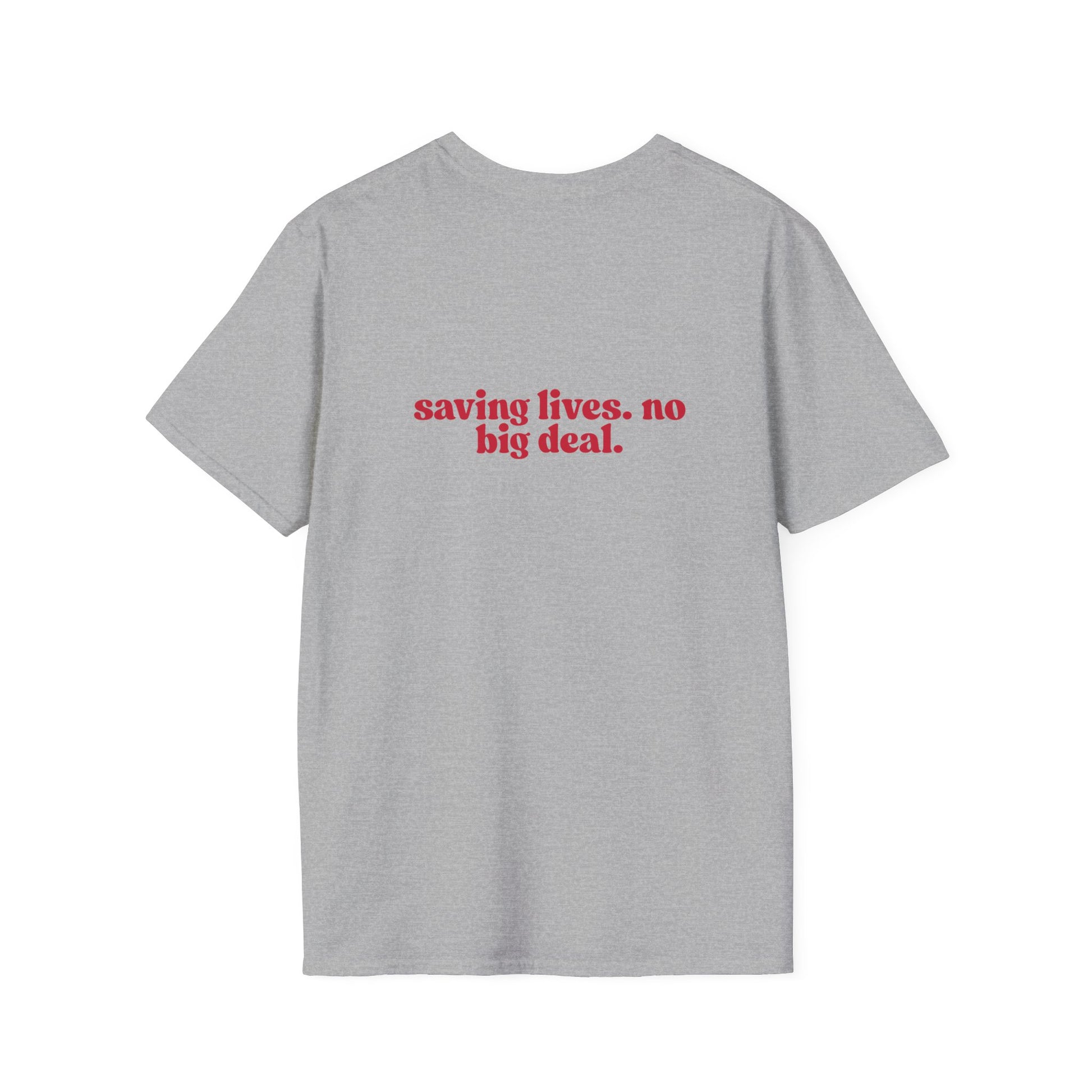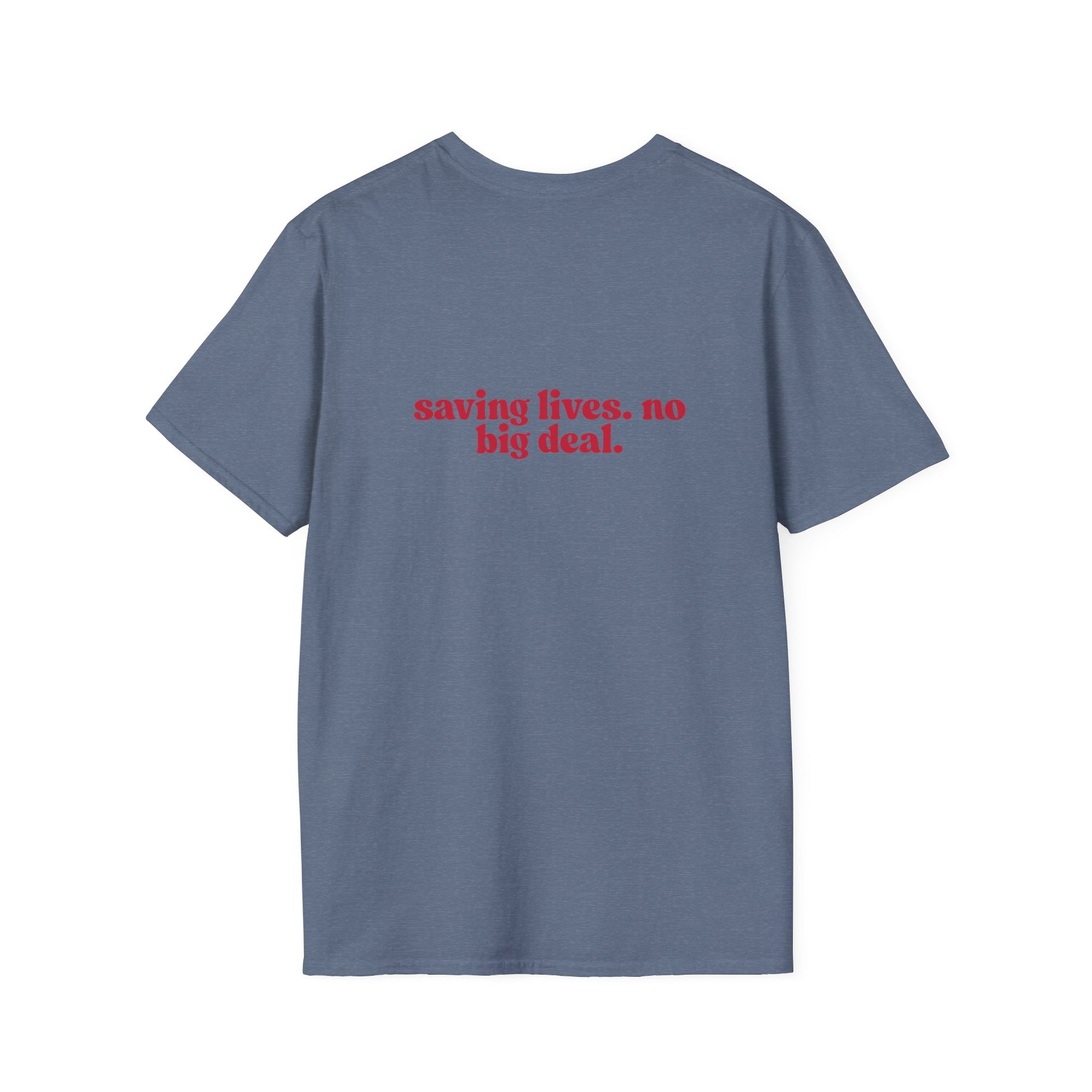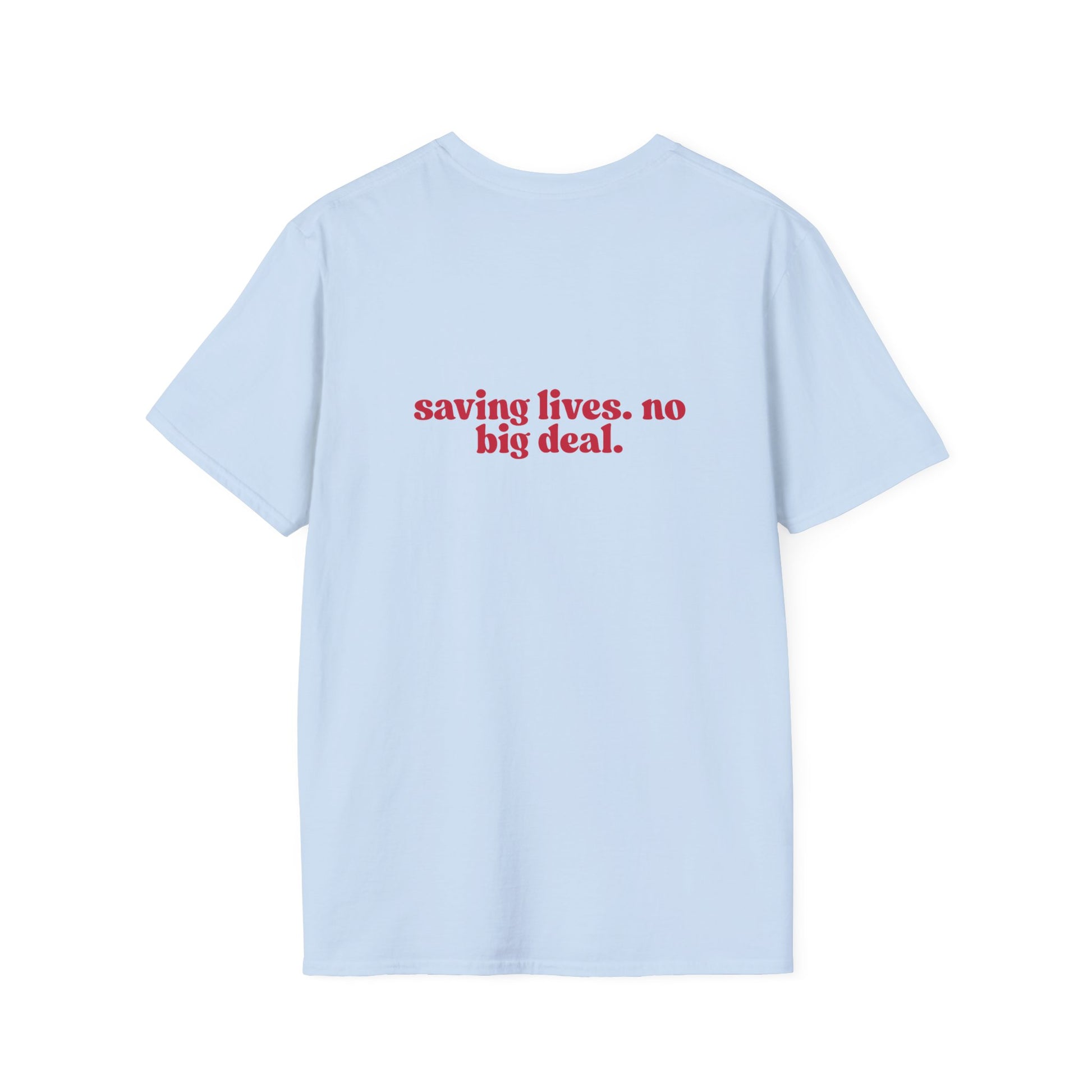 Show off your superhero scrubs energy with this bold and heartwarming nursing tee! Featuring a stethoscope shaped like a heart on the front and the phrase "Saving lives. No big deal." on the back, this shirt is perfect for nurses who handle chaos with compassion and a little bit of sass. Whether you're on shift, off duty, or just proud of what you do—this tee lets the world know that you make a difference (even if you act like it’s NBD).